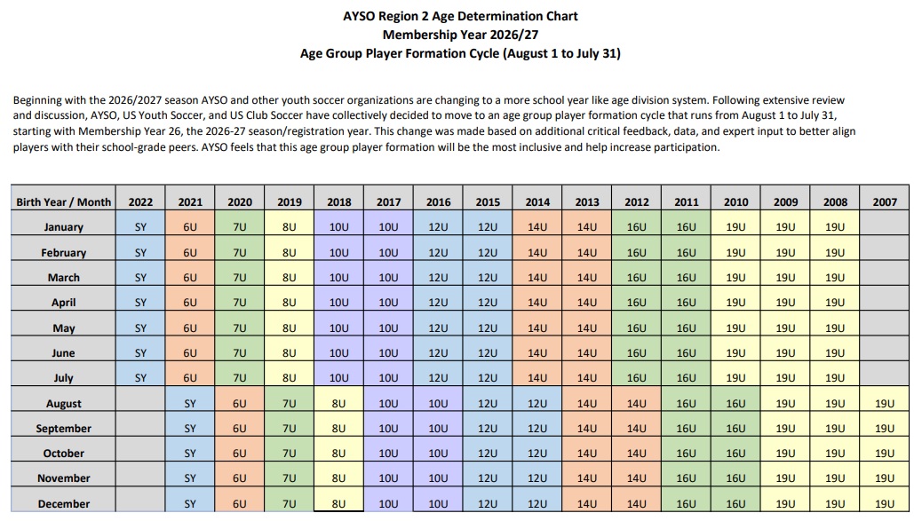 US Youth Soccer (USYS), US Club Soccer, and American Youth Soccer Organization (AYSO) have announced that they have agreed to adopt a seasonal year age group formation cycle for its players starting with the 2026-27 season. Current age group formation is based on a January. 1 - December 31 timeframe (“birth year”), this will be changed to a August 1 - July 31 timeframe beginning with the 2026-27 season. This represents the opportunity for more players to play soccer with their classmates.